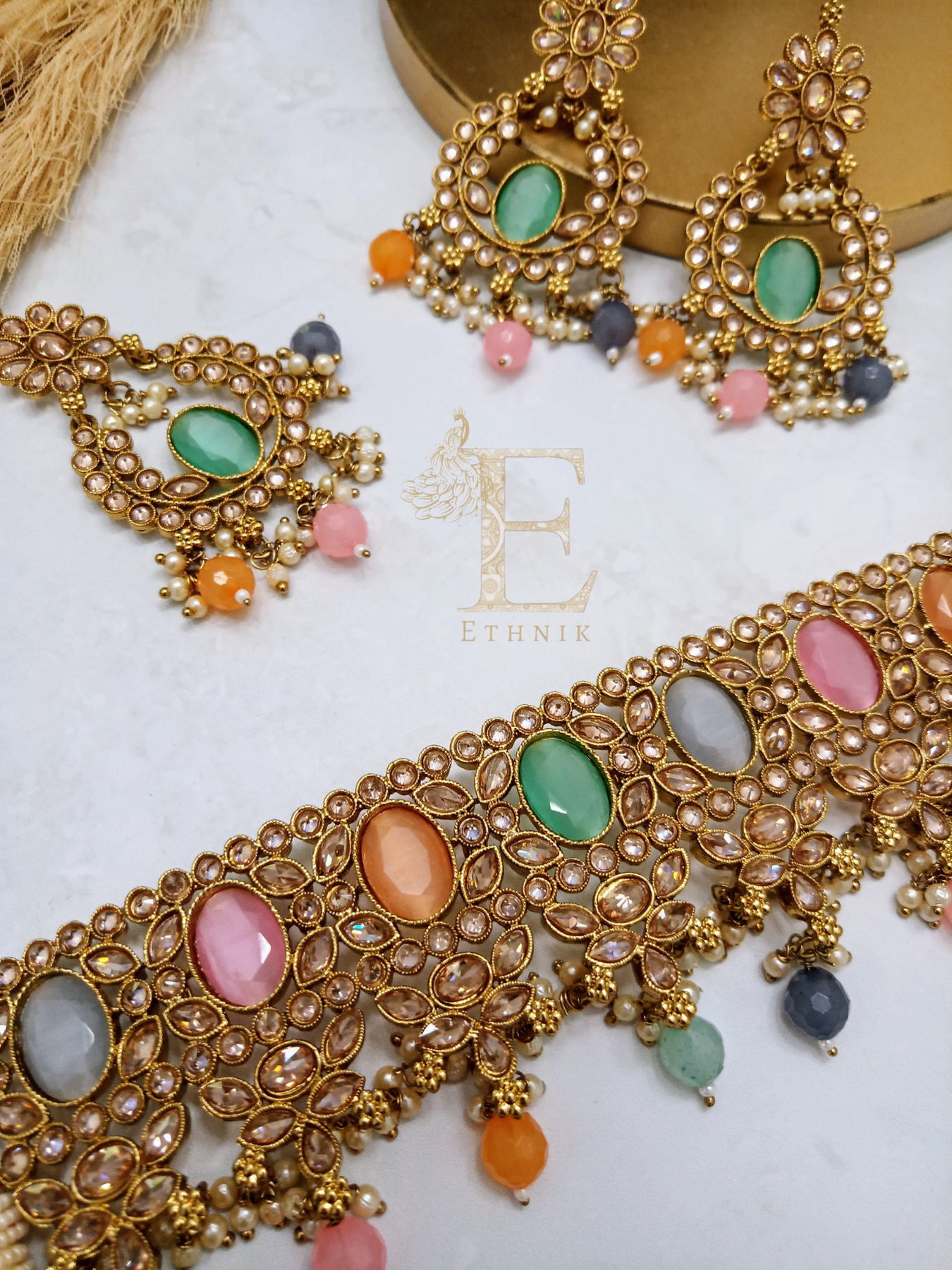 Why settle for ordinary when you can have extraordinary? This gold-plated Polki jewelry set is a true showstopper, designed to elevate your style with every sparkle. Featuring reversed imitated Polki diamonds set on a durable copper base, this piece offers both strength and sophistication. The timeless pearls bring an elegant touch, while the vibrant, colorful beads add a playful charm that ensures you stand out at any event.