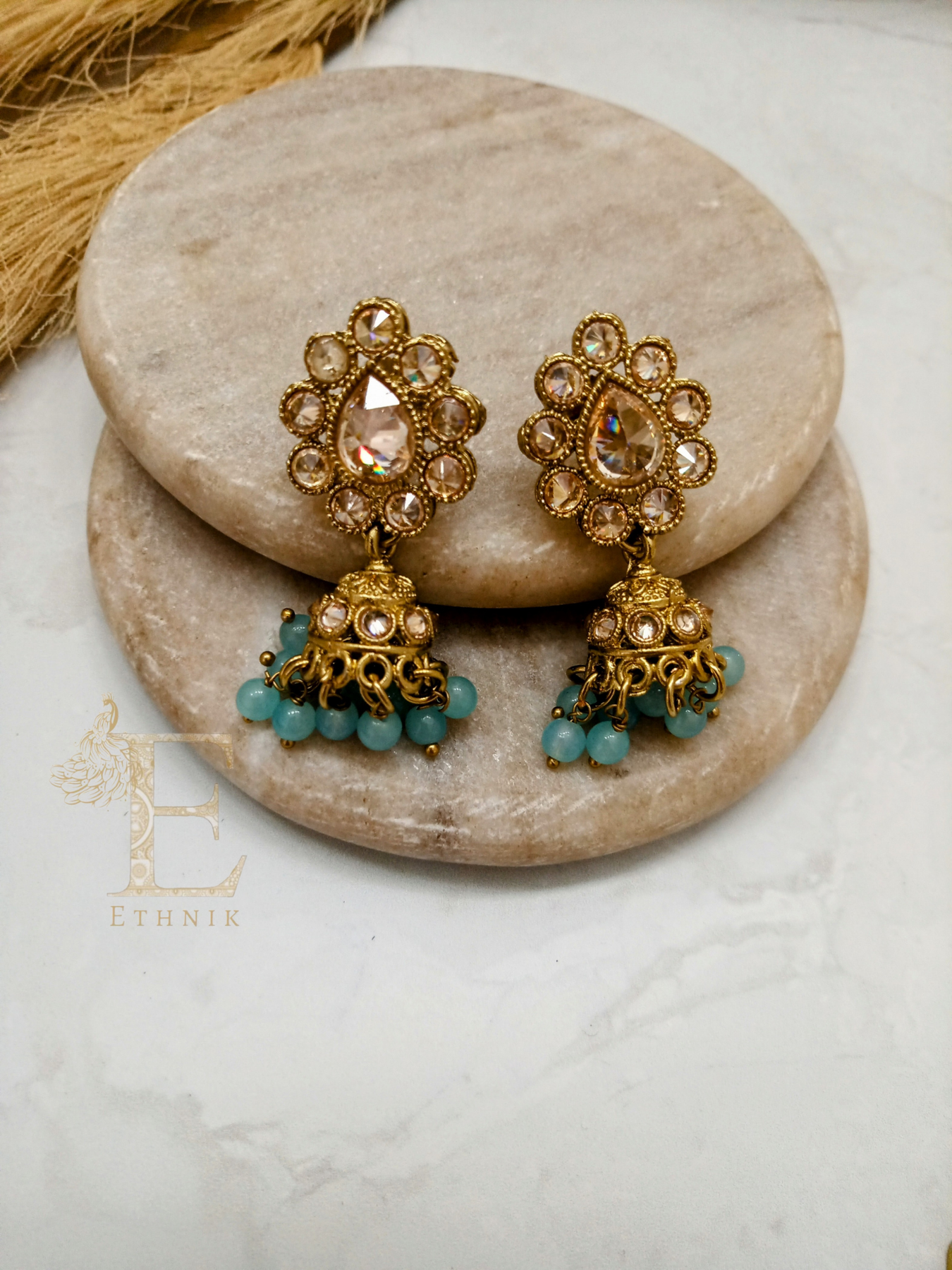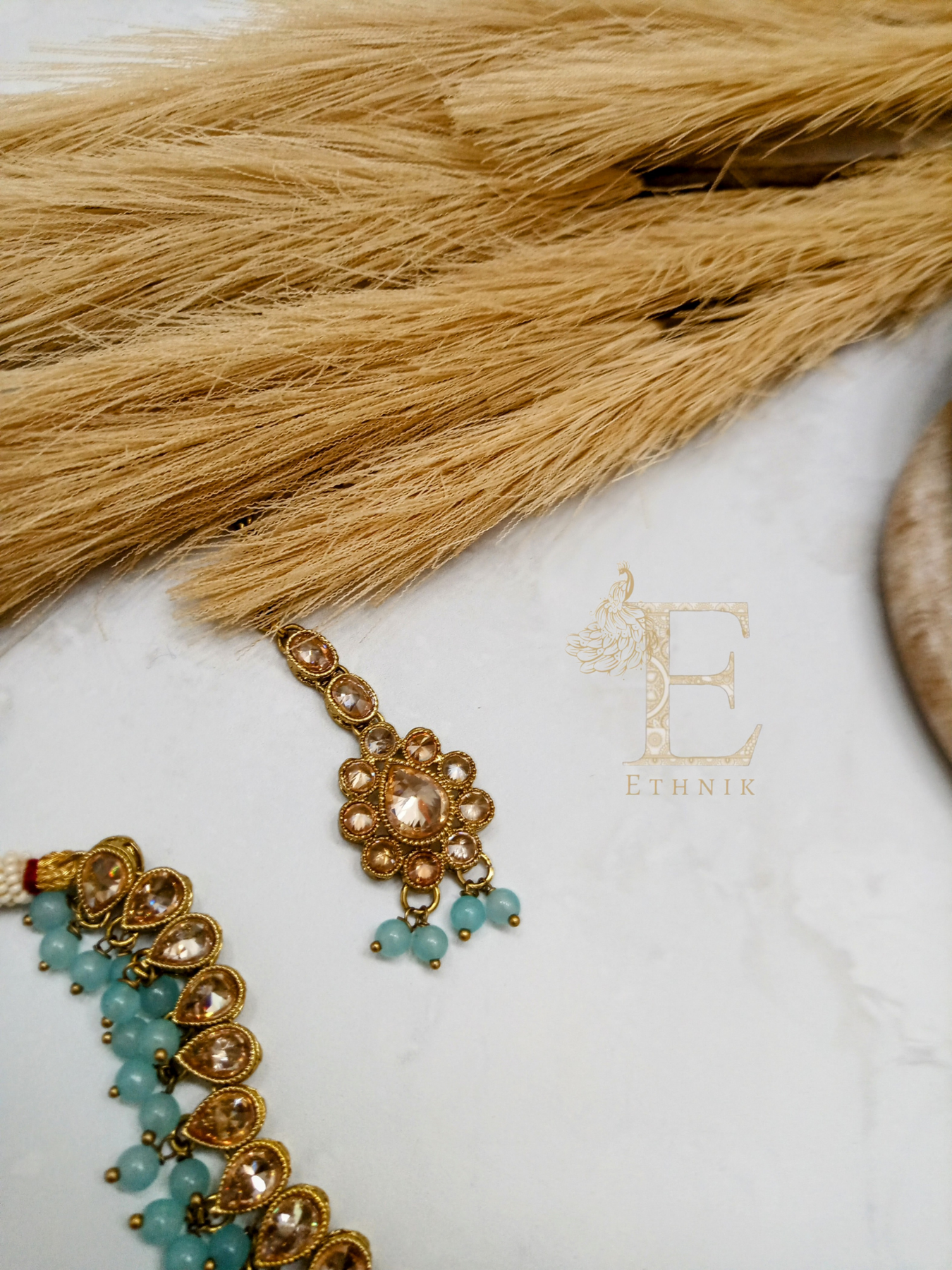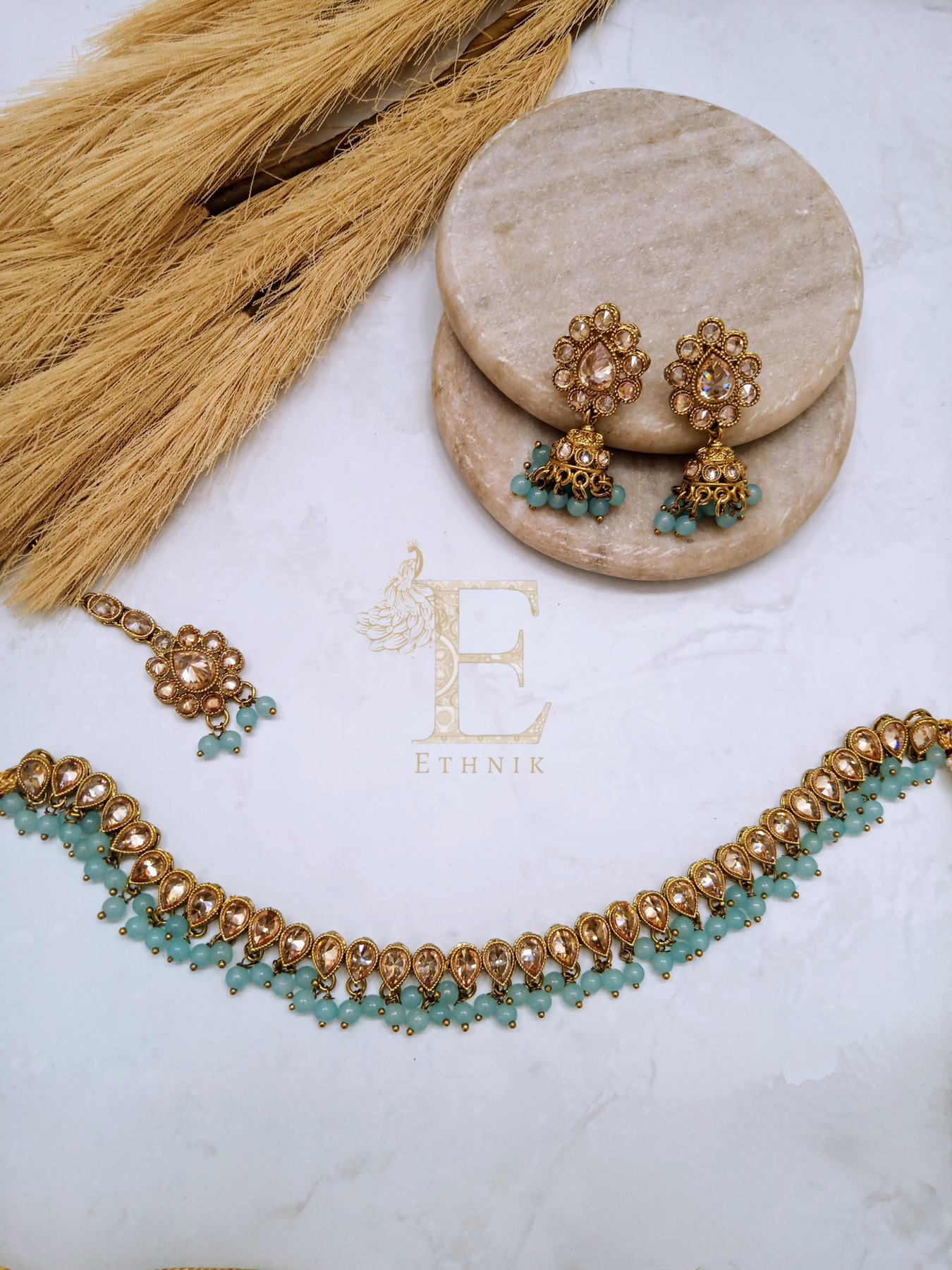For the ladies who love to keep it simple yet traditional, this set is the perfect match. Featuring a delicate single-line choker, dainty jhumkas, and a matching tikka, it offers effortless elegance without being overpowering. The Polki stones are designed to shine beautifully in any lighting, whether indoors or under the sun adding just the right touch of sparkle.